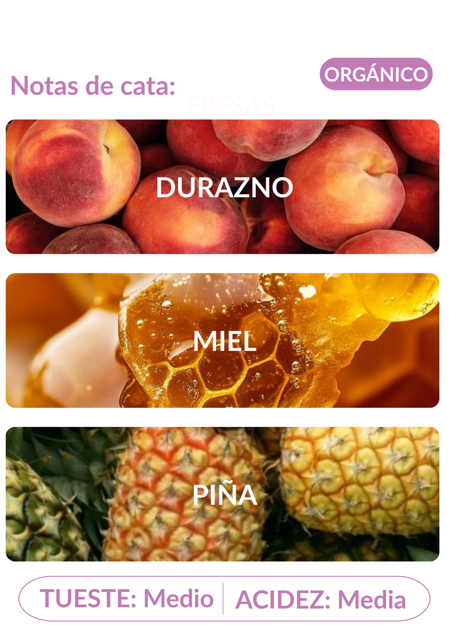 Notas de cata: con una acidez alta, ofrece sabores en taza que recuerdan a la miel de maple con tonos de piña, durazno y manzana verde.